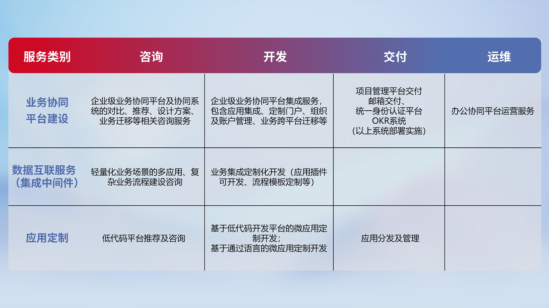 针对钉钉、、企微、、IDaas等平台级产品提供产品的规划、、方案、、、交付、、、、定制化开发等服务,,,实现如统一协同办公、、、智能客户服务、、、、混合会议管理、、、、智能数据查询、、、、等业务场景,,,,实现数字化转型。。。。